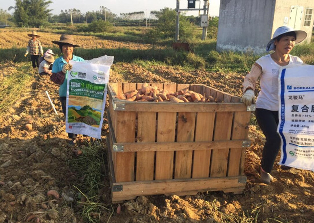 ? ? 據(jù)廣東中農(nóng)銷售人員介紹,前期每畝施用150斤龍駿馬高鉀復(fù)合肥,添加4公斤微生物菌肥菌劑,機(jī)器覆土,10天后下苗。追肥共2次,施肥用量為每畝150斤龍駿馬高鉀加60斤硫酸鉀。番薯種植基地施肥方案同樣適合根莖類作物,如番薯、土豆、淮山等。廣東中農(nóng)希望能在不斷的實(shí)踐過程中積累成功的可復(fù)制的施肥方案,讓更多的種植戶受益。
