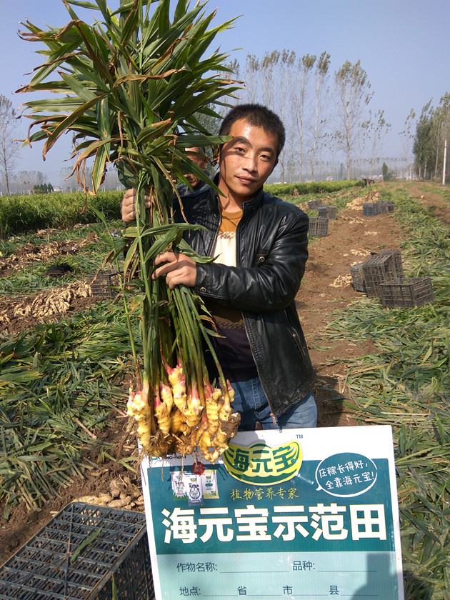 ? ? 據(jù)“海元寶”農(nóng)化服務(wù)人員介紹,示范田種植戶牛大江種植了6畝大姜,其中1畝用普通復(fù)合肥作為對(duì)照,其他5畝全程用“海元寶”大姜高產(chǎn)套餐施肥方案。示范田底肥用“海元寶”復(fù)合肥(15-10-15)100公斤、生物有機(jī)肥80公斤加中量元素有機(jī)肥80公斤。