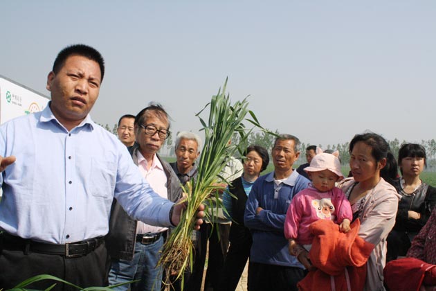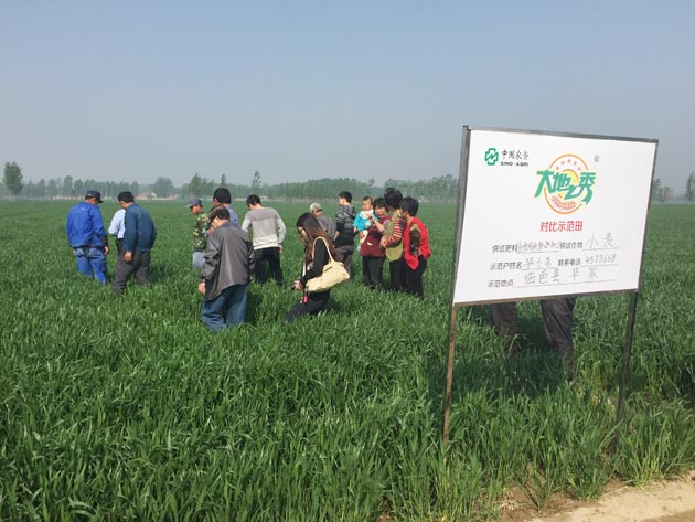 ? ? 4月24-25日,由中農(nóng)集團(tuán)控股股份有限公司(以下簡(jiǎn)稱中農(nóng)控股)和德州市德城區(qū)佳運(yùn)多棉花種植技術(shù)服務(wù)專業(yè)合作社聯(lián)合主辦的政府有機(jī)肥補(bǔ)貼項(xiàng)目試驗(yàn)田現(xiàn)場(chǎng)觀摩會(huì)暨有機(jī)肥及低殘留農(nóng)藥推廣項(xiàng)目分別在山東省德州市臨邑縣林子鎮(zhèn)窯廠村和畢家村召開(kāi)。中農(nóng)控股特聘農(nóng)化專家、原北京市農(nóng)林科學(xué)院植物營(yíng)養(yǎng)與資源研究所副所長(zhǎng)吳玉光、高級(jí)農(nóng)藝師閆保福與中農(nóng)控股農(nóng)化服務(wù)人員一道深入田間地頭,為農(nóng)民展示有機(jī)肥改良土壤效果并解決種植小麥生產(chǎn)中遇到的問(wèn)題,向農(nóng)民傳授提高肥料利用率及有關(guān)土壤改良的具體方案,為期兩天的小麥觀摩會(huì)吸引了當(dāng)?shù)剞r(nóng)民近100人。