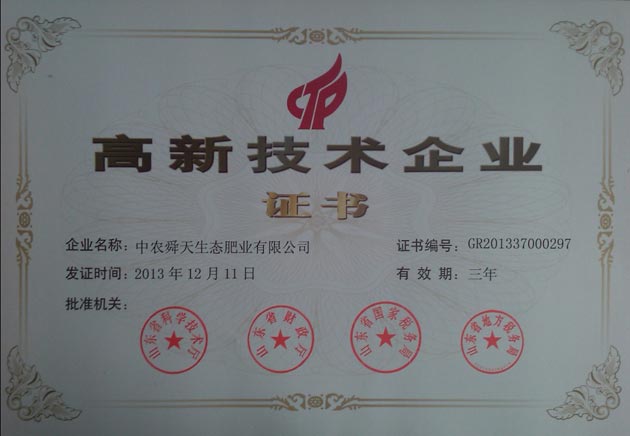 ? ? 日前,中農(nóng)舜天生態(tài)肥業(yè)有限公司(“中農(nóng)舜天”)榮獲山東省科技廳、山東省財(cái)政廳、山東省國(guó)家稅務(wù)局、山東省地方稅務(wù)局聯(lián)合頒發(fā)的“高新技術(shù)企業(yè)”證書。