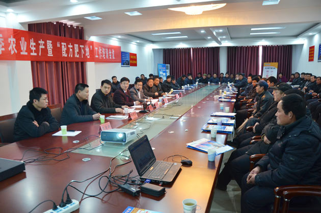 ?? ?2月15日,由中農(nóng)控股旗下中農(nóng)舜天生態(tài)肥業(yè)有限公司(以下簡稱“中農(nóng)舜天”)承辦的沂南縣春季農(nóng)業(yè)生產(chǎn)暨“配方肥下地”工作會在臨沂經(jīng)濟(jì)開發(fā)區(qū)召開,沂南縣有關(guān)領(lǐng)導(dǎo)及70余名種植大戶代表參加了會議。會議由沂南縣農(nóng)業(yè)局長莊乾德主持,中農(nóng)舜天總經(jīng)理李日升代表公司致辭。