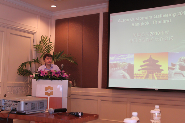 ??? 11月4日至6日,中農(nóng)控股股份有限公司磷復(fù)肥部經(jīng)理王秦燕一行參加了俄羅斯阿康股份有限公司在泰國(guó)曼谷召開的“核心客戶市場(chǎng)研討會(huì)”。??? 本次會(huì)議是在國(guó)際化肥市場(chǎng)行情持續(xù)上漲的背景下召開的。會(huì)議期間,阿康公司對(duì)全球市場(chǎng)過(guò)去一年的工作情況進(jìn)行了總結(jié),并對(duì)明年國(guó)際化肥市場(chǎng)的發(fā)展趨勢(shì)進(jìn)行了展望。阿康公司的主要客戶代表參加了此次研討會(huì),會(huì)議取得圓滿成功。??? 在我公司與阿康公司洽談中,王秦燕經(jīng)理表達(dá)了公司期望與阿康公司加強(qiáng)多方面合作的愿望,阿康公司也表示加強(qiáng)業(yè)務(wù)合作有利于雙方的長(zhǎng)遠(yuǎn)利益。雙方就加強(qiáng)重點(diǎn)合作業(yè)務(wù)方面交換了意見(jiàn)。??? 阿康公司是俄羅斯最大的化肥生產(chǎn)企業(yè),去年的化肥總產(chǎn)量達(dá)到450萬(wàn)噸。無(wú)論是在俄羅斯農(nóng)化市場(chǎng),還是在世界農(nóng)化市場(chǎng),阿康公司都占有較高的市場(chǎng)地位并享有良好的信譽(yù)。??? 圖為阿康公司2010年度中國(guó)核心客戶會(huì)議報(bào)告現(xiàn)場(chǎng):